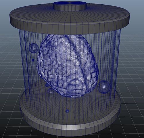 A jar with a brain and bubbles for some environment piece or representing some foreign AI. The actual brain was sculpted in ZBrush, but all the detail you see there will all be embedded in a normal map so not to wastes too much memory on all those vertices.
