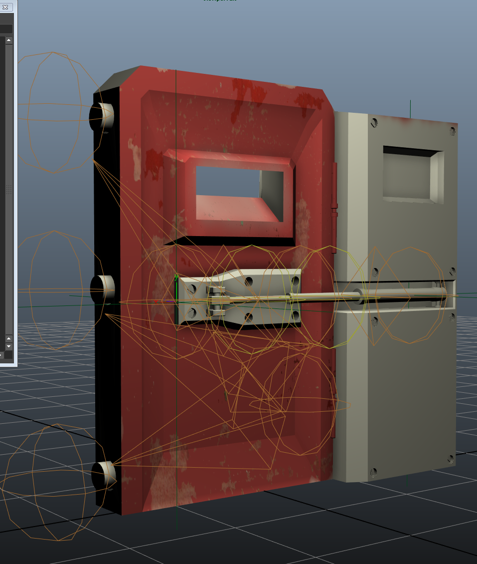 I have all the animations for this door finished and I am well on my way of getting it textured. Had to utilize some aim constraints for the skeleton to make sure that the hydraulic pistons would behave as intended, so that also meant that I had to bake out the animation. It was very late when I started texturing it and I wanted to run outside, take some reference photos and utilize those. But I just had to settle for sampling some photos of google, but I really need to create my own little library of reference textures to use.