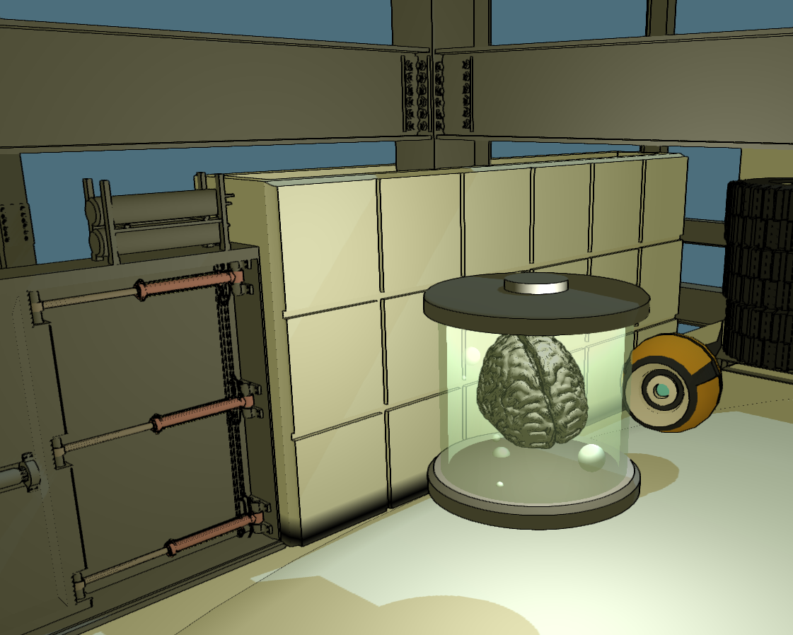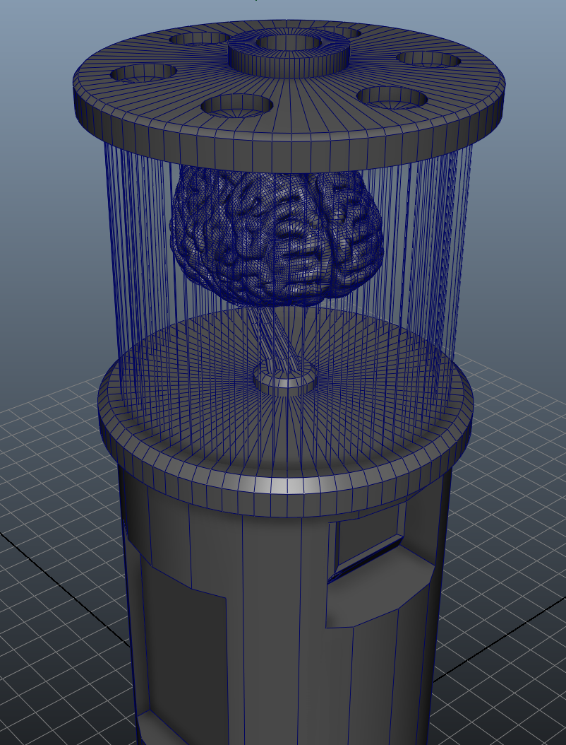 I wanted to see how my little jar of brain would look in engine and it looks just fine. It is missing its texture, but it looks very nice. I am actually adding some more detail to this prop. Some wires attached to the brain and some electronic equipment exposed under the jar. Like the brain is alive and connected… or can be connected to.