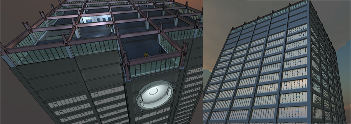 There are some cube map reflections on the windows, and you can see an entrance down below that might give you an idea that the area on the floors below is somewhat different.