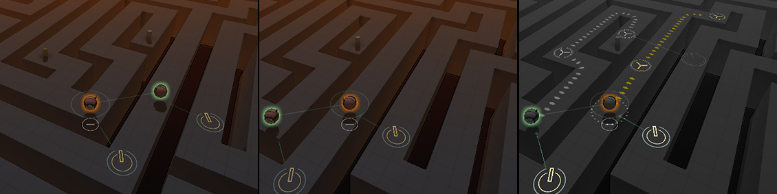 When the machines are within a certain proximity of each other, the jumping UI will appear and allow you to jump between the machines, so that you can program multiple instances of them and synchronize their movement. The little UI for jumping between machines needs to be handle the case of multiple machines within proximity and then there is only the activity trigger to open gates and activates other game pieces.